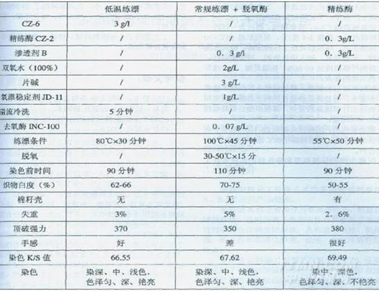 經CZ-6低溫練漂,不使用燒堿、強腐蝕性的雙氧水和滲透劑、穩定劑等多種助劑。練漂后工作殘液pH值小于9,COD、BOD值比常規燒堿、雙氧水工藝低,練漂后水洗次數及用水量減少,減輕污水處理壓力,滿足清潔生產的要求。