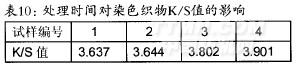 從表l0中數據可以看出,隨著處理時問的增加,染色后織物的K/S值逐漸增大,說明雙氧水處理時間增加,織物白度增強,染色后織物的表觀色深則降低。