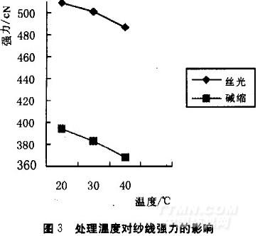 測量經(jīng)不同溫度燒堿雙絲光及兩次堿縮后紗線的強力及染色性能、吸附性能的變化,結(jié)果如圖3、圖4所示。