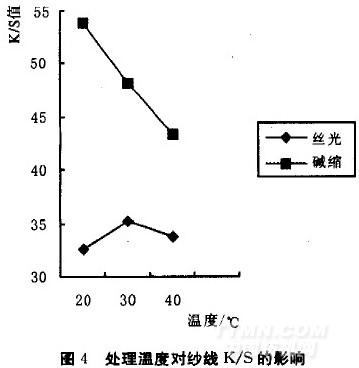 由圖1和圖2可知,無論是雙絲光還是兩次堿縮,燒堿的濃度都是在280 g/L時效果較好。同時還可看出雙絲光后的紗線強力比兩次堿縮后的紗線強力大,但K/S值卻小,即染色性能和吸附性能較差。這是因為絲光后的棉纖維因溶 脹,使大分子間的作用力遭到破壞,在張力的作用下,纖維大分子的排列趨于整齊,使取向度提高 當受到外力作用時,就能由更多的大分子均勻承擔,受力均勻。纖維因某個大分子斷裂的幾率降低,同時經(jīng)膨化而重排的纖維相互緊貼,抱合力提高,消除或減小了 纖維因大分子滑移而發(fā)生斷裂的因素,所以強力得到提高。而堿縮紗線處理時沒有受到張力的作用,因而強力較小。