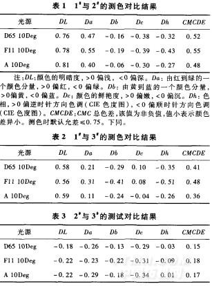 以1試樣作為標準,2試樣測色對比結(jié)果見表1。以1試樣作為標準,3試樣測色對比結(jié)果見表2。以2試樣作為標準,3試樣測色對比結(jié)果見表3。