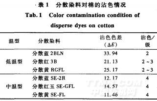 選用低溫型分散染料三原色分散藍2BLN、分散紅3B、分散黃RGFL和中溫型分散染料三原色分散藍SE一2R、分散紅玉SE—GFL、分散黃SE-FL為研究對象,考察2類分散染料對棉組分的沾色性能,結果如表1所示。