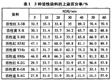 用3種類型的活性染料按1.2.2節染色工藝分別對麗賽纖維進行染色,分別在染色過程中的不同時刻測定上染百分率,結果如表1所示。