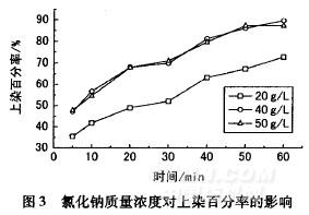 活性紅R3BJ2%(0wf)在60℃染色60min,染色開始時加入氯化鈉,食鹽質量濃度對上染百分率的影響見圖3。