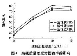 圖4中,純堿在活性染料染色中起固色作用,隨著純堿質量濃度的增大,染料的固色率增大,當純堿質量濃度增大到l0L時,染料的固色率基本達到最大值;繼續增加純堿質量濃度,固色率略有降低。
