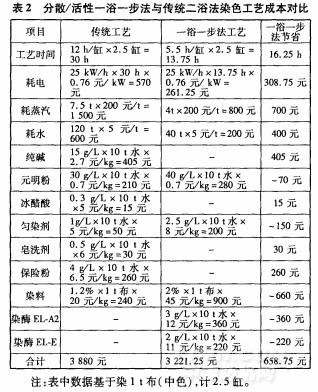 滌棉織物分散/活性一浴一步法工藝將加工時間從12h縮減為5.5h,大大節(jié)約水、電、汽,其與傳統(tǒng)二浴法工藝的成本對比見表2。
