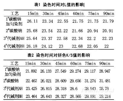 增加2 純堿得色最深,其次是l 純堿加勻染劑,接著是4 代堿劑BH和3 代堿JUAn,說明使用純堿作為固色劑時的得色量要高于代用堿。同時在純堿工藝中隨著勻染劑的加入,染料初染率相對純堿工藝要低,織物表面得色率也降低,顏色淺淡;前75 min明度L值逐漸減小,K/S值逐漸增大,當75 min后1 、3 工藝L值基本不變,2 、4 L值仍有所減小,這是因為隨著時間延長,織物得色量有所增加,顏色越深,顯得萎暗;而1 、4 工藝L值變化不明顯,當固色75 min后,染料上染速率已達到平衡。