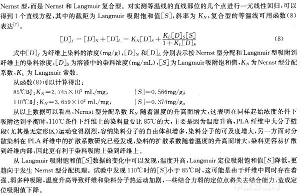 b)PI A纖維的染色熱力學研究表明,分散藍RSE上染聚乳酸纖維的吸附等溫線不完全服從Nernst分配型,而是Langmuir與Nernst的復合型;隨著溫度升高,Nernst型分配系數KN增大,Langmuir定位吸附飽和值Es]降低,更趨向于發生Nernst型分配機理。