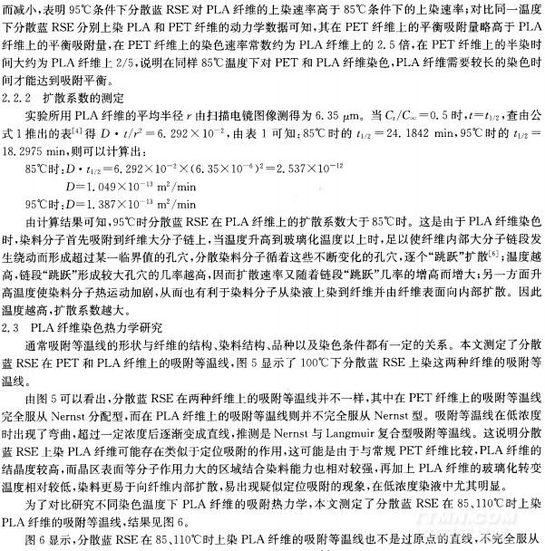 a)PLA纖維的染色動力學研究表明,95℃時分散藍RSE對PLA纖維的平衡吸附量、染色速率常數和擴散系數均大于85℃時;同樣在85℃染色條件下,分散染料上染聚乳酸纖維的半染時間比染滌綸要長,即達到吸附平衡需要更長的時間。