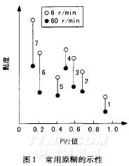 以原糊的PVI值為橫坐標,以表觀黏度的對數(lgn)為縱坐標作圖,即為原糊的示性圖。位于示性圖右側的原糊PVI值大,用旋轉式黏度計測定原糊的表觀黏度,在轉速相差10倍時,其叼變化幅度較小(垂線較短),說明印花機車速變化對原糊的影響較小;位于示性圖左側的原糊則相反。常用原糊的示性如圖1所示。