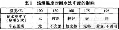 FS4l7S是熱反應型產品,焙烘溫度對其耐洗牢度有影響。焙烘溫度過低,FS4l7s的環氧基團與織物上活潑基團反應不徹底,耐水洗牢度變差;焙烘溫度過高,會使Fs417s裂解、黃變,透明度變差。選擇合適的焙烘溫度十分重要(見表1)。