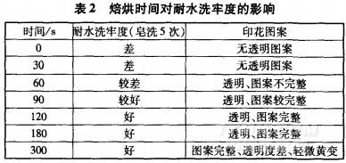 焙烘時間對印花效果也有影響。焙烘時間短,FS-417s的反應基團與織物上的活性基團反應不徹底,結合牢度差,皂洗牢度降低;焙烘時間過長,造成不必要的能源浪費,增加生產成本,降低生產效率,同時導致織物輕微黃變(見表2)。