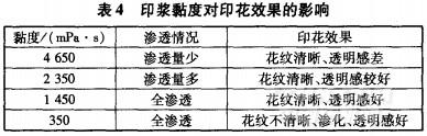 透明印花漿FS417s的黏度,是影響色漿滲透性和上漿量的主要因素。水溶性醇類等溶劑可以降低FS_417s的黏度,促進(jìn)透明印花漿的滲透,提高透明度。但黏度過低會造成印制圖案滲化,降低一等品率。增稠劑Fs-200是印花漿FS417s專用增稠劑,可在不影響透明效果的前提下提高印漿黏度。根據(jù)不同織物的特點(diǎn),將Fs4l7S調(diào)至適當(dāng)黏度,才能達(dá)到最佳的透明印花效果(表4)。
