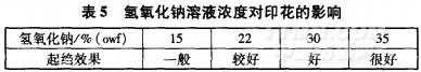 用FS_417s印花后的織物浸軋氫氧化鈉溶液,可以獲得透明起縐印花和透明泡泡紗加工效果。浸軋堿液和軋堿后的堆置,目的使織物充分定形,達(dá)到最佳的起縐和起泡效果。軋堿量大,可使棉織物未印花部分充分收縮、定形,而使印花部分起縐、起泡更加明顯,凹凸感更強(qiáng)(表5)。