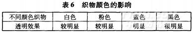 采用FS4l7S,以相同的印花工藝(平網(wǎng)印花)在不同顏色的織物上印花,發(fā)現(xiàn)透明效果有一定差異。色澤深的織物透明效果較白色織物好,特別是黑色織物經(jīng)堿縮后,起縐透明感更強(qiáng),透明效果更好。這是由于深色織物與白光(太陽光)對比度大,印制后的圖案與基布差異明顯,透明效果更加明顯(表6)。