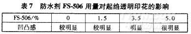在透明印花漿FS_417S中添加防水劑FS.506,對起縐透明印花有明顯的影響。防水劑Fs.506在加熱交聯(lián)后,具有極強(qiáng)的防水、拒水性能,使FS_417S具有更強(qiáng)的定形、保形作用,印花部分不受堿的影響,使印花部分不收縮,而不印花部分收縮,從而形成凹凸感、鏤空感更強(qiáng)的透明花紋,更富藝術(shù)效果(表7)。