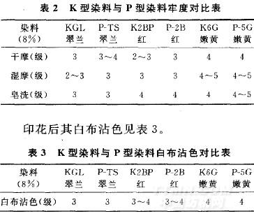 由表1可以看出P—TS翠蘭得色量比KGI翠蘭高20,P一2B紅得色量比K2BP紅高1O,P一5G嫩黃得色量要比K6G嫩黃高5,且P型染料印花色澤飽滿,顏色鮮艷。