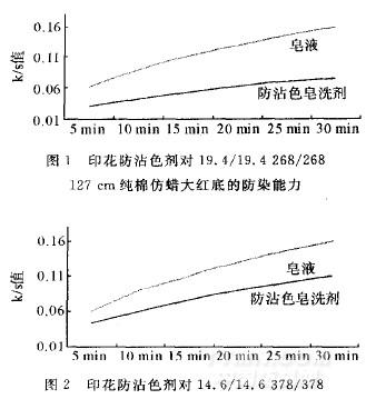 印花織物經(jīng)蒸化后的色牢度及鮮艷度,很大程度取決于水洗皂洗的效果,而選擇性能優(yōu)良的皂洗劑,對防止白底沾污,提高鮮艷度尤為重要。我公司過去選用的皂洗劑,是由非離子表面活性劑,苯磺酸鹽與其他助劑復(fù)配而成,做一般活性印花的皂洗液尚可,但對于白底深色印花且要求白底較白的產(chǎn)品,如:雙邊深色仿臘花布,其白邊及留白處沾色嚴(yán)重,影響產(chǎn)品質(zhì)量。為此我們又對皂洗劑配方進行了多次改進,增加了具有分散、吸附、螯合、助洗、增白等作用的多功能螯合分散劑、三聚磷酸鹽、CMC等成分,提高了其防沾色能力,使其既具有一定的凈洗能力,又具有良好的防染能力,對提高產(chǎn)品的鮮艷度,防止白底污染,具有良好的作用。實驗表明:加入印花防沾染劑的防沾污能力遠(yuǎn)遠(yuǎn)大于一般皂洗液的防沾污能力。結(jié)果見圖1、圖2,圖中K/S值表示沾污程度,K/S值越小則表示織物受沾污越輕。