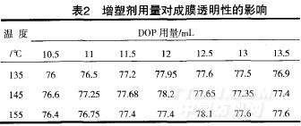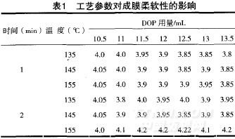 由表1可知,在熱處理的溫度和時間不變時,隨著DOP用量的增加,薄膜柔軟性有逐漸增加的趨勢。但是在155oC,兩分鐘的熱處理條件下成膜的柔軟性明顯出現了下降。