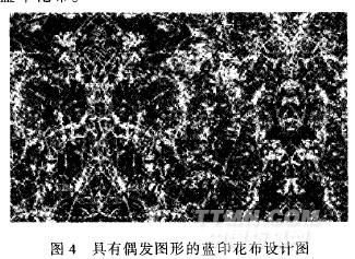 藍印花布圖案體現出拙樸獷野、細致精巧、爽朗秀麗、平靜悠遠的意韻,其典型穩定在某種意義上限制了后續產品的開發思路。今天,圖案意韻協調于流行風格已成為設計界的共識,而流行變化加速已成為不可逆轉的趨勢,所以,藍印花布的圖案意韻要積極求變。在后現代主義思潮中,隨機、任意的色彩圖形得到進一步重視。借鑒后現代藝術觀念技巧如抽象表現主義,直接把拔色漿料自由灑落在深色面料上,達到偶發性的拔色效果,或用水“射擊”涂布防染漿料的面料,形成偶發的防染狀態,都能夠得到視覺動感更突出的偶發性色彩效果。圖4是以偶發性意味強烈的抽象表現主義技巧創造的具有偶發圖形的藍印花布。