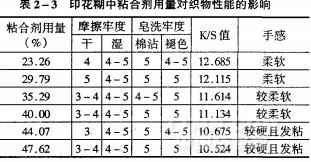過多的乳化糊首先在調漿時發生困難,色漿很稠,攪勻困難。在印花的時候較稠的印花色漿無法順利通過網孔,導致織物印色不勻,整理過的織物手感也很差。由表2—4可以確定,選擇乳化糊的用量為總色漿質量的4.26%。