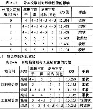 交聯劑含有兩個或兩個以上官能團,對非反應粘合劑起著極大的作用,而在本身可自交聯的粘合劑中加入少許,也可以使交聯效果更好,本實驗選擇的外加交聯劑為高反應性交聯劑,遇水即可發生反應,故在調漿完成以后印花之前加入數滴,攪勻即可印花。使用以上優化的印花工藝進行印花。,如下表2—5可以看出交聯劑的加入可以提高摩擦及皂洗牢度,對K/S值影響不大值,但用量過多使織物手感變硬,而且會增加工業生產成本,所以選擇外加交聯劑用量為3滴,質量約0.15g。