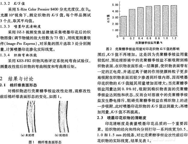 儀器 x.Rite Color Premier 8400分光光度儀(美國愛色麗有限公司),DZ一3視頻變焦顯微鏡(13本U—nion公司),KES.FB2織物風格評定系統純彎曲試驗儀(日本加藤技研株式會社),R210噴墨打印機(Ep—son公司),R-3焙烘箱(臺灣瑞比染色試機有限公司),HH-6數顯恒溫水浴鍋(金壇榮華儀器廠)。