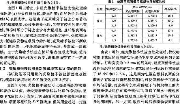 摘 要:采用殼聚糖季銨鹽對棉織物進行改性處理,探討了改性處理對棉織物水性顏料墨水噴墨印花性能的影響。結果表明,經殼聚糖季銨鹽改性后,棉纖維表面變得光滑,并形成一層薄膜;殼聚糖季銨鹽改性可提高噴墨印花織物的K/S值,當殼聚糖季銨鹽用量為0.8%時,K/S值由原先的3.20提高到4.87;噴墨印花的防滲化性能得到增強,印花清晰度提高,打印0.5 mm線條時,處理后織物經緯向的實際線寬清晰度分別提高16.5%和12.6%;改性后印花棉織物的彎曲剛度和彎曲滯后矩略有增加,織物手感略微變差。
