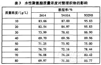 采用不同軟硬段結(jié)構(gòu)的水性聚氨酯(PU)對棉蓋滌針織物進(jìn)行吸濕快干整理,通過測試聚氨酯的穩(wěn)定性,整理織物的親水性及快干性等,最終選擇Y410A水性聚氨酯作為吸濕快干整理劑,質(zhì)量濃度為1Og/L。與其它市售的常用整理劑相比,在吸濕快干性、導(dǎo)濕量、手感、彈性等方面,Y410A與其它整理劑相當(dāng)或稍優(yōu)。