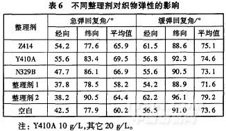 采用Y410A10g/L對棉蓋滌針織物進(jìn)行整理,測試整理后織物親水性能、舒適性(透氣量、透濕量和手感)以及彈性等性能,并與市售的其它同類整理劑比較,結(jié)果見表4—6。