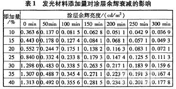 采用PR.305熒光余輝亮度測試儀測試涂層的余輝性能,設置激發照度1000lx。由于夜光涂層對光照十分敏感,在測試過程中不能受其它光線影響,因此,試驗必須在夜間或在比較暗的情況下進行。