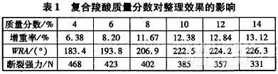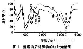 表1中,隨著復合羧酸用量增加,尤其在10%質量分數以內,處理試樣的增重率、折皺回復角都有較大的增加,但強力有所降低。當復合羧酸用量較低時,酯化反應率較低,棉織物上有未酯化反應的羥基,可與蘆薈發生反應。隨著羧酸用量增加,棉纖維中生成的交聯鍵限制了纖維素大分子鏈在外力作用下的相對滑移,引起應力集中,使斷裂強力下降4。