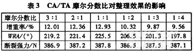 由表3知,在CA整理液中加入TA可以提高織物折皺彈性,增加蘆薈吸附量。當CA:TA=1:1時,整理效果最好。這主要是因為在吸熱和次亞磷酸鈉催化劑的條件下,酒石酸分子的2個仲羥基可能結合2個檸檬酸發生酯化反應,從而形成空間立體網狀結構,比CA更有效地對棉進行交聯,進而吸附蘆薈蒽醌化合物。在這個過程中,檸檬酸上的羥基被封閉,消除了CA與纖維素分子中羥基酯化反應的障礙,增強了CA與棉纖維的交聯。用不同摩爾分數比的CA/TA整理液,整理的棉織物強力變化不大剖。