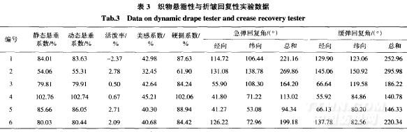 3)折皺回復(fù)性測(cè)試:按照((GB3819—1997紡織品織物折痕回復(fù)性的測(cè)定回復(fù)角》,取凸形試樣,采用YG541E全自動(dòng)激光織物折皺彈性測(cè)試儀測(cè)得急彈與緩彈下的回復(fù)角.實(shí)驗(yàn)5次取平均值,結(jié)果見表3.