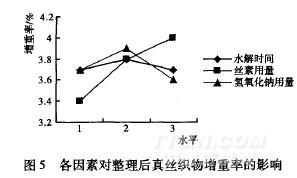 (2)絲素整理劑用量對各指標的影響:隨絲素整理劑用量增加,白度略有提高,急彈與緩彈先增大后有所降低,斷裂強力和增重率隨之增加。結合表4看出,對斷裂強力與增重率,絲素用量的極差最大,取水平3最好;對白度,絲素用量影響適中,取水平3最好;對急彈與緩彈來說,取水平2或3均可。織物的急、緩彈折皺回復角隨著絲素整理劑用量的增加而增大,到30g/L時達到最大,4Og/L時有所降低。這是由于絲素整理劑用量過大時,大部分絲素分子只能附著在纖維表面,只有一部分分子進入蠶絲纖維內部的縫隙中。隨著絲素溶液用量的增加,纖維間的黏附力及交織點的黏結作用增強,折皺回復性有所下降,手感變硬。對于白度、斷裂強力、增重率3個性能來說,絲素用量取40 L最好,綜合考慮5個指標,絲素整理劑用量取40g/L較好。