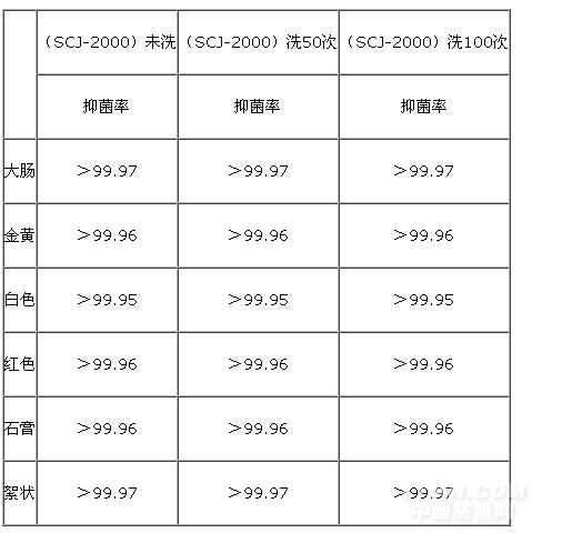 用奎因氏法測定洗過不同次數抗菌樣品對大腸桿菌、金黃色葡萄球菌、白色念珠菌、紅色毛癬菌、石膏樣小芽胞菌、絮狀表皮癬菌的抑菌效果: