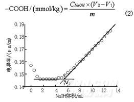 羧基含量:采用電導滴定法測定[2]。將試樣用去離子水充分水洗至電導率恒定,然后自然晾干,在干燥箱中于105℃烘2h,迅速稱其干重(m);再把試樣剪成小塊,用0.1mol/L的鹽酸浸漬20min(浴比1:50),然后用去離子水抽濾水洗至洗液中不含氯離子。把抽濾水洗好的試樣投入到含有0.5 mL 0.1 mol/LHCl、5mL 0.1 mol/LNaCl的500 mL去離子水溶液中,再用濃度為0.02 mol/L的NaOH溶液滴定,每滴0.5 mL測定一次電導率;根據NaOH溶液體積和電導率的關系作圖,如圖1所示。應用外推法即可得到消耗的NaOH溶液體積(V2),然后做空白試驗,得到中和空白滴定體系需要消耗的NaOH溶液體積(V1),按式 (2)計算羧基含量,每個試樣測三次,取平均值。