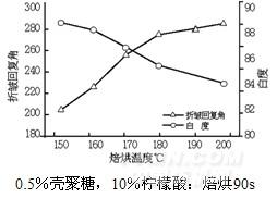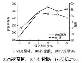用濃度為0.5%殼聚糖溶液與不同濃度檸檬酸混合,催化劑次亞磷酸鈉濃度為6%,對織物進行整理。檸檬酸濃度對織物的折皺回復角、白度的影響見圖4。從圖中可看出,隨著檸檬酸濃度的增加,織物的折皺回復角逐步增加,這是因為檸檬酸與棉纖維分別在低側序區和中等測序區發生交聯。但是隨著檸檬酸濃度的增加也伴隨著織物白度的下降,這是由于焙烘到一定溫度,檸檬酸脫水產生烏頭酸和衣康酸。