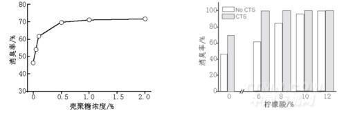 圖6殼聚糖農度對織物消臭率的影響 圖7檸農度對織物消臭率的影響