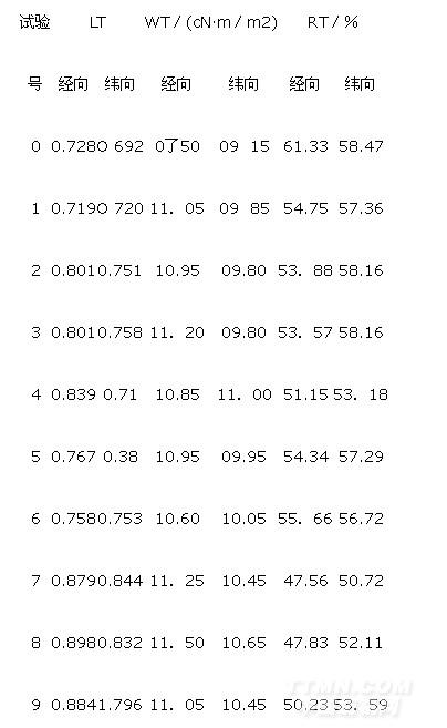 LT表示織物的柔軟感,LT值越小,表示織物越柔軟;W/T表示織物的變形抵抗力,W/T了值越大,織物越堅挺,不易變形;RT表示織物的拉伸回彈性,RT值越大,織物回彈性越好。