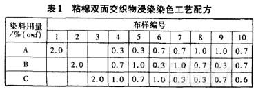采用Dataeolor 650測配色儀,以粘膠面為標樣,棉面為批次樣,分別測試粘棉雙面交織物的附(加權強度)和△H (色相)。Wgt反映表觀色深和顏色濃淡的相近程度;△H則反映了色相或色調的相近程度。Wgt值越接近100% ,△H在一1~+1之間,則同色性越好。