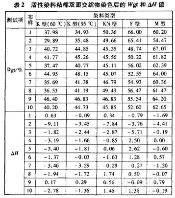 選用的活性染料采用60℃浸染法染色,其中K型染料采用兩種工藝(60℃浸染和95℃浸染)染色,按表1所示染料用量染色,然后測試織物的Wgt和△H值,結果見表2。