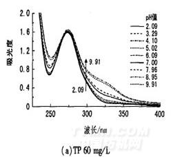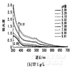 圖1是不同質量濃度茶多酚溶液在不同pH值下7O℃處理1 h后的紫外可見光譜曲線。