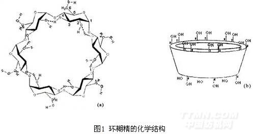 是六個(gè)以上葡萄糖分子以α—1,4糖苷連接的環(huán)狀低聚物,其中葡萄糖殘基呈4C1椅式結(jié)構(gòu)如圖(9)1(a)所示。最常見的是α—環(huán)糊精(r—CD),β—環(huán)糊精(β—CD)和γ—環(huán)精精(γ—CD);分別由六個(gè)、七個(gè)和八個(gè)葡萄糖分子構(gòu)成。經(jīng)X—射線衍射和核磁共振研究證明:環(huán)糊精的立體結(jié)構(gòu)是中空兩端開口的錐形園環(huán)形(或稱喇叭形環(huán))如圖1(b)所示。呈近似Cn軸對(duì)稱,結(jié)構(gòu)穩(wěn)定,不易受酸、矸、酶和熱作用而分解。