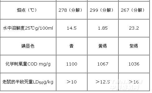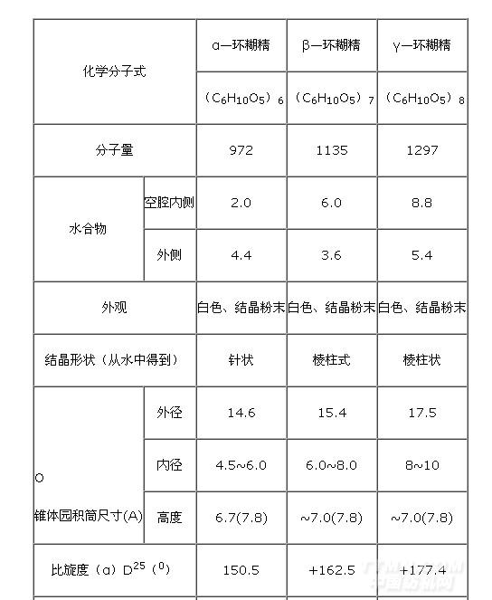商品環(huán)糊精的純度可達(dá)99%,含水分為9%±1%,灰分0.02%以下。α—、β—和γ—環(huán)糊精三個(gè)品種的主要性能如表1,所示。