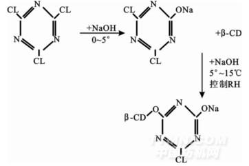 即第一步在低溫(0~5℃)水中分散三聚氯氰,制得透明的二氯三嗪鈉鹽;第二步在較高溫度(5~15℃)下二氯三嗪鈉鹽和β-環糊精在矸性條件下反應,當取代度達0.4就完成,得率(按三嗪)從78%增至88%,經提純噴霧干燥得白色粉末狀一氯三嗪β-環糊精。
