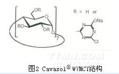 一氯三嗪-β-環糊精(MCT-β-CD)已工業化生產,其商品名為CAVASOL®W7MCT,由Wacker泰龍公司生產,商品對每個葡萄糖的取代度為0.4,可保證在紡織品上有良好固著性能(耐久的錨點)(1),其構造式如圖2所示