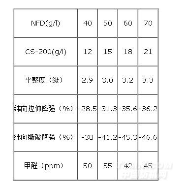 2.5.2.4 低甲醛免燙樹脂NFD,用NFD 樹脂整理的織物,游離甲醛含量低,免燙效果好,黃變小,降強小。