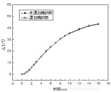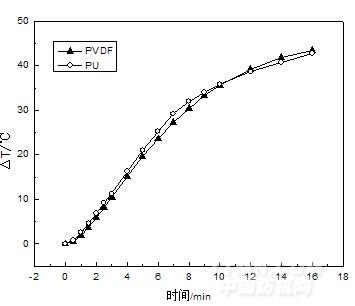 由圖7可知,在輻射時間內,PVDF基和PU基TiO2涂層織物的輻射時間——溫度變化曲線極為相似。所不同的是,在前10 min的輻射時間內,PU基TiO2涂層織物的內側溫度增加量高于PVDF基的,PVDF基TiO2涂層織物的隔熱性能優于PU基的;而輻射10 min后,PVDF基TiO2涂層織物的內側溫度增加量高于PU基的,PU基TiO2涂層織物的隔熱性能優于PVDF基的。這可能與PVDF基TiO2和PU基TiO2在織物上具有不同的分布狀態有關。PVDF基TiO2在織物上分布較密集,其在織物上的附著量明顯多于PU基TiO2的。在短的輻射時間內,由于PVDF基TiO2涂層織物表面附有一層密集的對熱輻射具有較強反射作用的TiO2,致使熱輻射較難透過織物進入內側,形成累積,所以其隔熱性能較好。但經較長時間輻射后,由于PU基TiO2涂層織物和PVDF基TiO2涂層織物上的TiO2粒子對熱輻射具有同等的反射效果,而PVDF基TiO2涂層織物上富余的TiO2粒子會對熱輻射產生吸收,吸收的能量通過熱傳導進入織物內側,形成累積,所以其內側溫度增加較多,但區別不大。