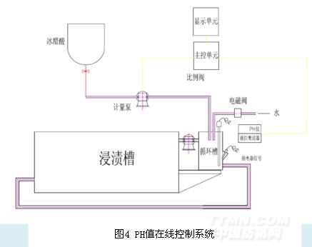 系統可以實現PH值的在線閉環控制,安裝有探頭自動清洗裝置,無需人工干預及維護。對PH值的控制還可通過在線滴定方式實現,如圖4所示: